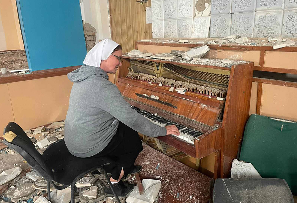 Sr. Lydia Timkova sits down at a piano in destroyed property in a village near Mykolaiv, eastern Ukraine. (Courtesy of Lydia Timkova)