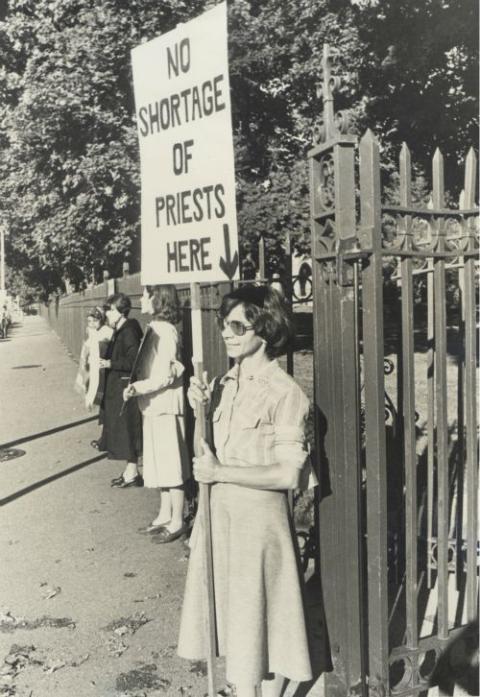 Members of the Boston Women's Ordination Conference pickets men's ordination Sept. 15, 1979, in Newton, Massachusetts. (NCR photo/Harry Brett)