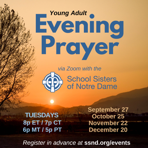 The North American Vocation Team (NAVT) of the School Sisters of Notre Dame (SSND) invites young adults ages 18 and older to a monthly online evening prayer on Tuesdays at 8 p.m. EST (7 p.m. CST) via Zoom. The remaining dates for evening prayer during 2022 will be September 27, October 25, November 22 and December 20. More information and registration for the Zoom links is available at ssnd.org/events/.