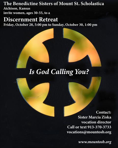 Join the Benedictine Sisters of Mount St. Scholastica in Atchison, Kansas, for a weekend Discernment Retreat - from 5:00 pm on October 28 through 1:00 pm (Central Time) on October 30. Women between the ages of 30 and 55 are welcome to share in the prayer, work and meals, while getting to know the community.
