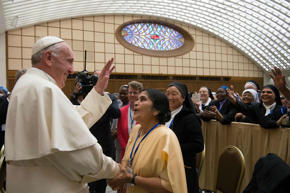 Pope Francis greets a nun during an audience with the heads of women's religious orders in Paul VI hall at the Vatican May 12. During a question-and-answer session with members of the UISG, the pope said he was willing to establish a commission to study whether women could serve as deacons. (CNS /L'Osservatore Romano)