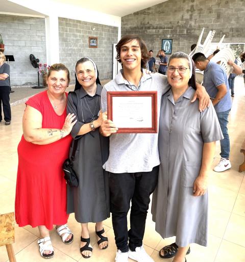Sr. Graciela Trivilino, second from left, with one of the young adults who recovered at the fazenda, as he receives a diploma to become an "Ambassador of Hope" (Courtesy of Graciela Trivilino)