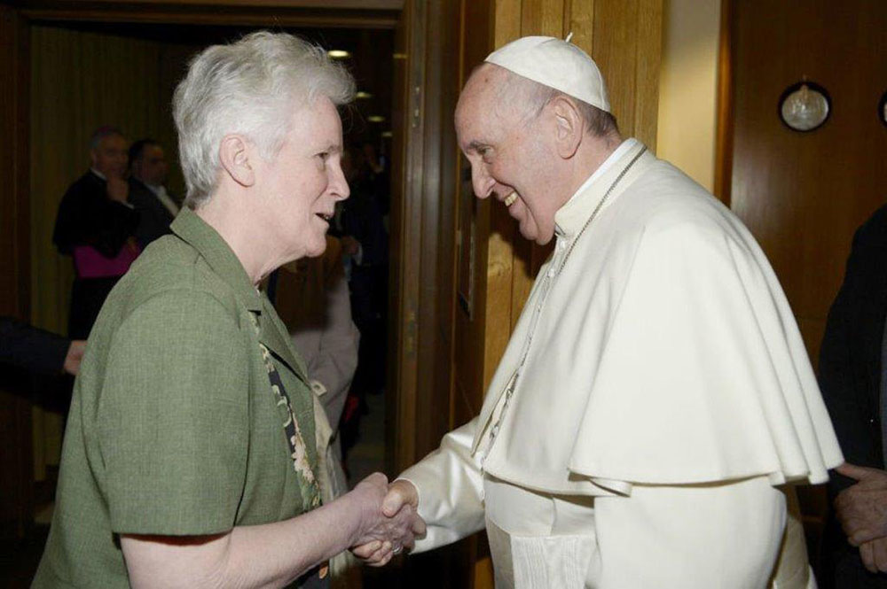 Sr. Nancy Brown met Pope Francis in April 2019 at the International Conference on Human Trafficking in Rome to introduce and study Pastoral Orientations on Human Trafficking. (Courtesy of Nancy Brown)