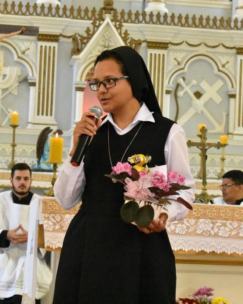 Sr. Mayara Glayci Lopes Santana, 29, from Brazil, during her first profession of vows Sept. 9, 2018. She presently ministers with families in an impoverished community north of São Paulo, Brazil. (Courtesy of Roseglé Gamba)