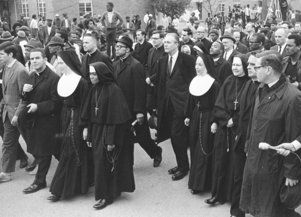 Sr. Mary Antona Ebo, a Franciscan Sister of Mary, is pictured in the front row at the center with her superior, Sr. Eugene Marie Smith, as they march in Selma, Ala., March 10, 1965, to support voting rights for Blacks. (CNS file photo from the St. Louis Review)