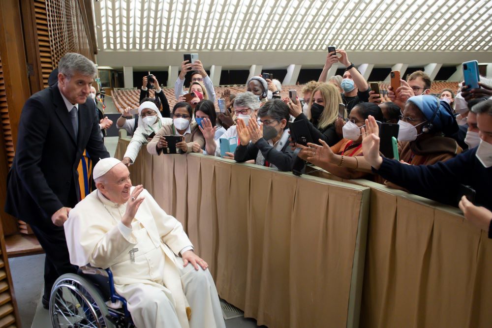 Pope Francis is pushed in a wheelchair by his aide, Sandro Mariotti, as he greets participants in the plenary assembly of the International Union of Superiors General on May 5 at the Vatican. (CNS/Vatican Media)
