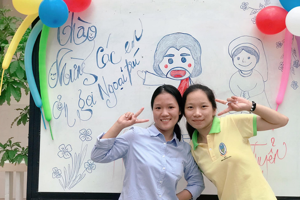 Srs. Mary Truong Thi Sen, left, and Anna Nguyen Thi Nhung pose for a photo before a banner, welcoming vocation candidates to the Daughters of Our Lady of the Visitation's headquarters in Hue, Vietnam, April 23. They plan to hold another vocation gathering on May 7. Nhung said the number of newcomers to the congregation have reduced from 100 to 45 in recent years. She believes one reason for that is because many local families ignore faith practice and send their children to look for jobs in other places to make a living. (Joachim Pham)