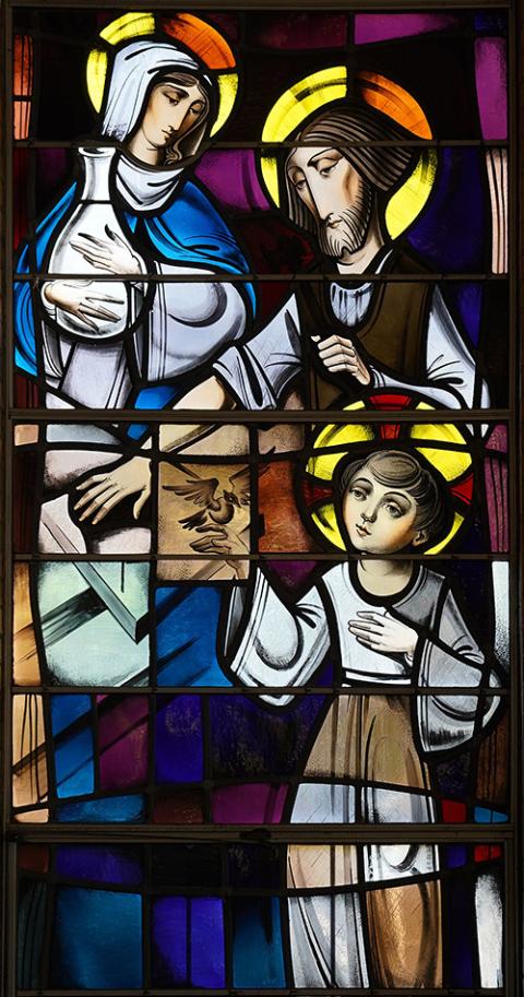 The Holy Family of St. Joseph, Mary and Jesus is depicted in a stained-glass window at St. Joseph Church in Ronkonkoma, New York. (CNS/Gregory A. Shemitz)