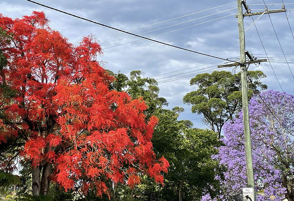 A flame tree that blooms around Christmastime, next to an “Advent” Jacaranda tree in Australia (Tracey Edstein)