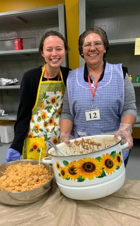 Juanita, right, and I serve a picadillo and rice at Annunciation House in some sunflower gear. (Provided photo)