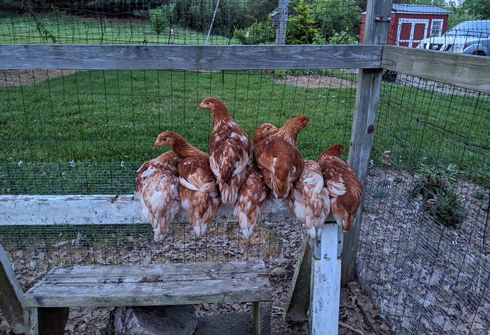 These chickens gather in their coop before nightfall. I recently helped a friend "critter sit" and watched the family's chickens, cats, and dogs. Of them all, I must admit that watching and interacting with the chickens was my favorite. (Julia Gerwe)
