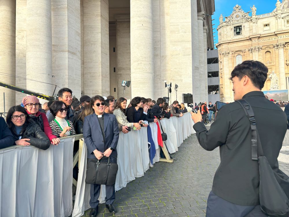 A group of young people awaits the funeral for Pope Francis at the Vatican April 26. (NCR photo/Soli Salgado)
